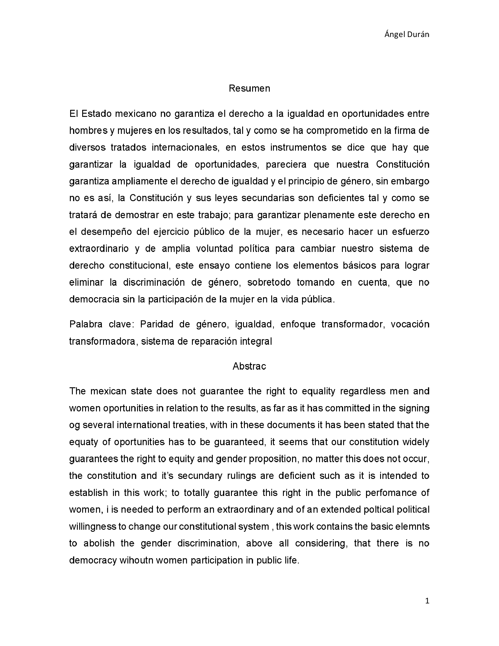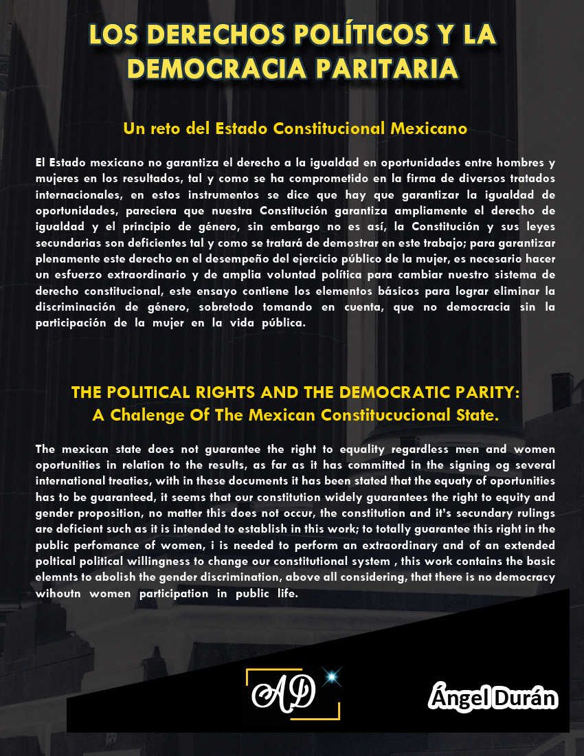 El Estado mexicano no garantiza el derecho a la igualdad en oportunidades entre hombres y mujeres en los resultados, tal y como se ha comprometido en la firma de diversos tratados internacionales, en estos instrumentos se dice que hay que garantizar la igualdad de oportunidades, pareciera que nuestra Constitución garantiza ampliamente el derecho de igualdad y el principio de género, sin embargo no es así, la Constitución y sus leyes secundarias son deficientes tal y como se tratará de demostrar en este trabajo; para garantizar plenamente este derecho en el desempeño del ejercicio público de la mujer, es necesario hacer un esfuerzo extraordinario y de amplia voluntad política para cambiar nuestro sistema de derecho constitucional, este ensayo contiene los elementos básicos para lograr eliminar la discriminación de género, sobretodo tomando en cuenta, que no democracia sin la participación de la mujer en la vida pública.