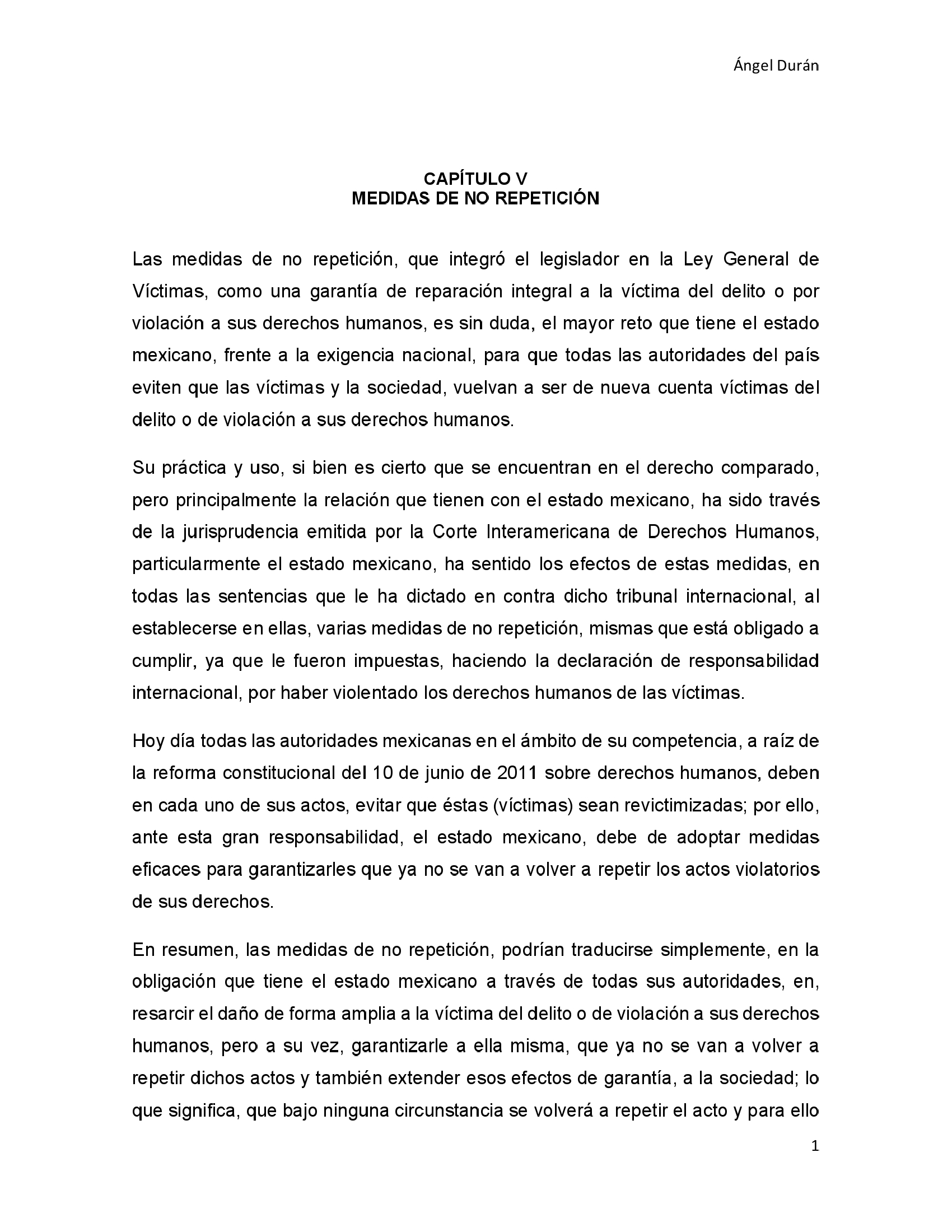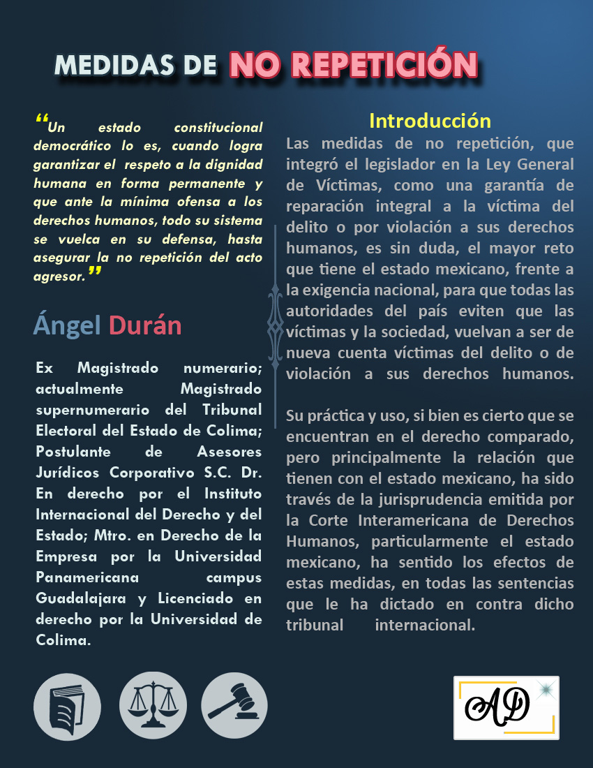 Las medidas de no repetición, que integró el legislador en la Ley General de Víctimas, como una garantía de reparación integral a la víctima del delito o por violación a sus derechos humanos, es sin duda, el mayor reto que tiene el estado mexicano, frente a la exigencia nacional, para que todas las autoridades del país eviten que las víctimas y la sociedad, vuelvan a ser de nueva cuenta víctimas del delito o de violación a sus derechos humanos.