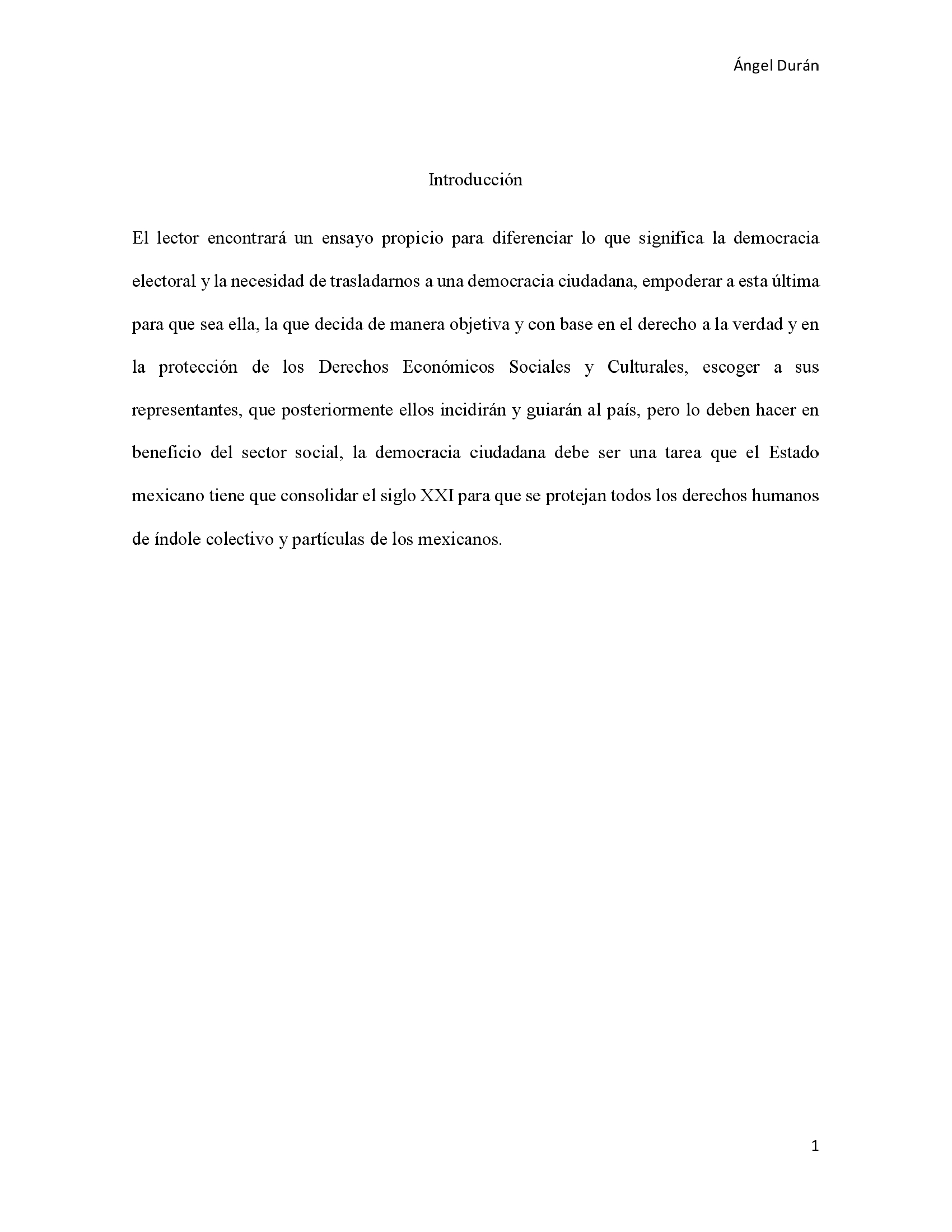 El lector encontrará un ensayo propicio para diferenciar lo que significa la democracia electoral y la necesidad de trasladarnos a una democracia ciudadana, empoderar a esta última para que sea ella, la que decida de manera objetiva y con base en el derecho a la verdad y en la protección de los Derechos Económicos Sociales y Culturales, escoger a sus representantes, que posteriormente ellos incidirán y guiarán al país, pero lo deben hacer en beneficio del sector social, la democracia ciudadana debe ser una tarea que el Estado mexicano tiene que consolidar el siglo XXI para que se protejan todos los derechos humanos de índole colectivo y partículas de los mexicanos.