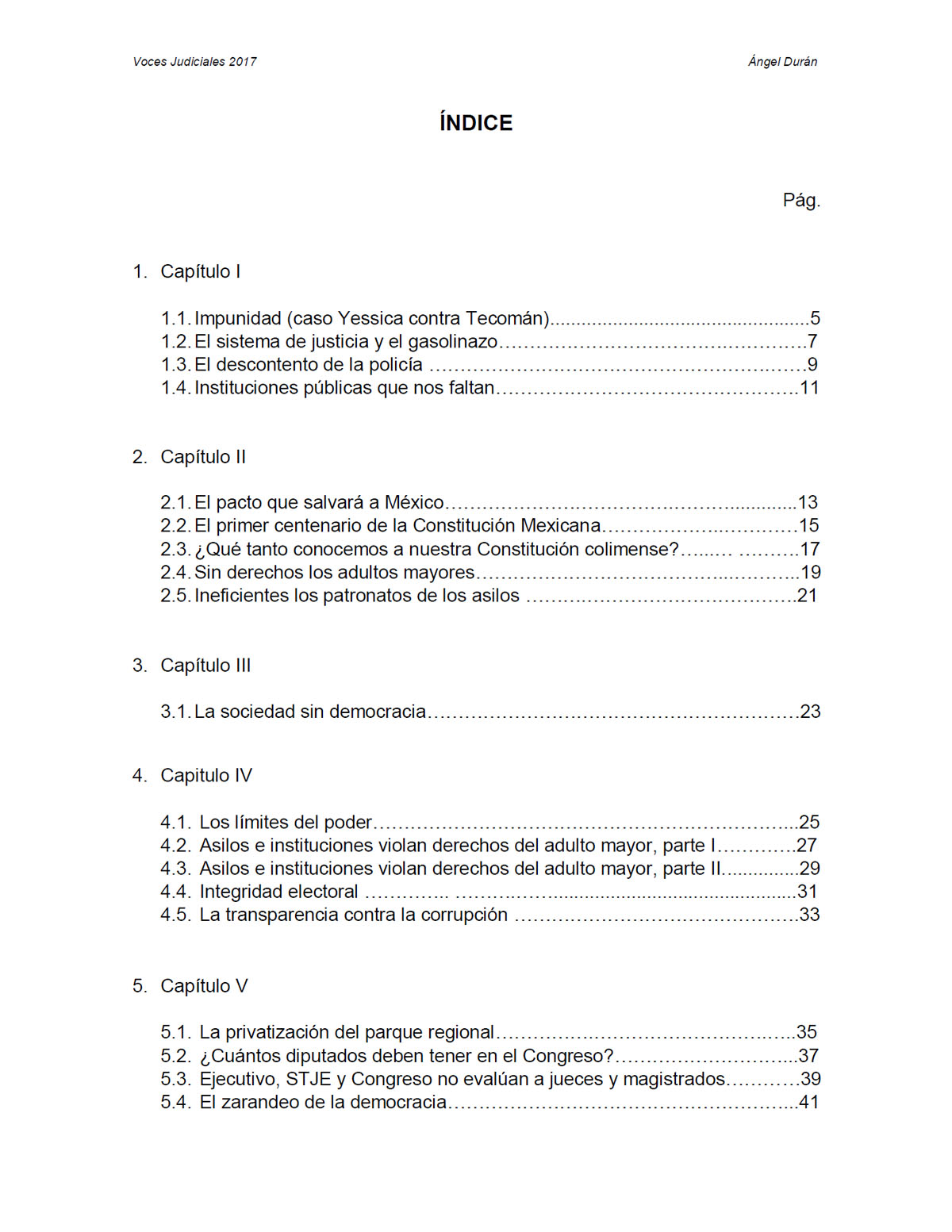 El lector encontrará en esta revista, a una serie de publicaciones que, como columnista del medio de comunicación Ecos de la Costa, estuve realizando cada mes, durante todo el año. El contenido de esta revista es eminentemente jurídico, dada mi especialidad y amparados en la libertad de expresión. Cada vez más, se observa a los jueces salir de sus escritorios y a opinar ante la sociedad civil, sobre sus pensamientos ideológicos; mi pensamiento ideológico que, como Magistrado Supernumerario del Tribunal Electoral del Estado de Colima, tiene como objetivo principal la difusión de temas jurídicos y con la idea de difundir el pensar de un juez electoral, que garantiza la democracia en México.